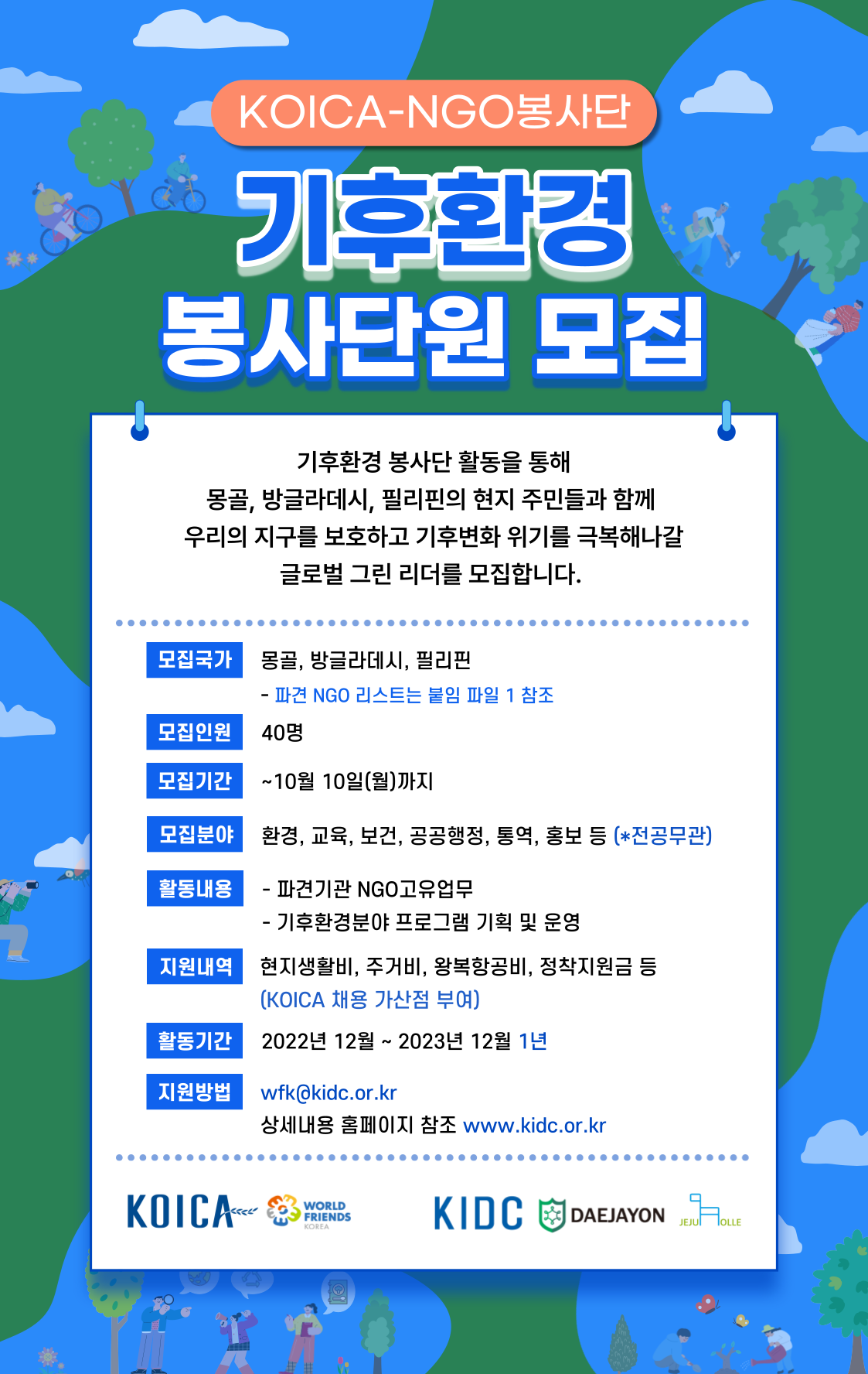 모집개요 ■ 모집인원 : 40명 ■ 파견국 : 동티모르, 캄보디아, 필리핀 (국가별 13~14명 파견) ■ 활동기간 : 파견기간 : 파견일로부터 1년(2022년 12월 중 파견) ■ 서류접수기간 : ~2022년 9월 30일(금) 자정까지