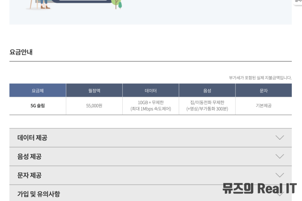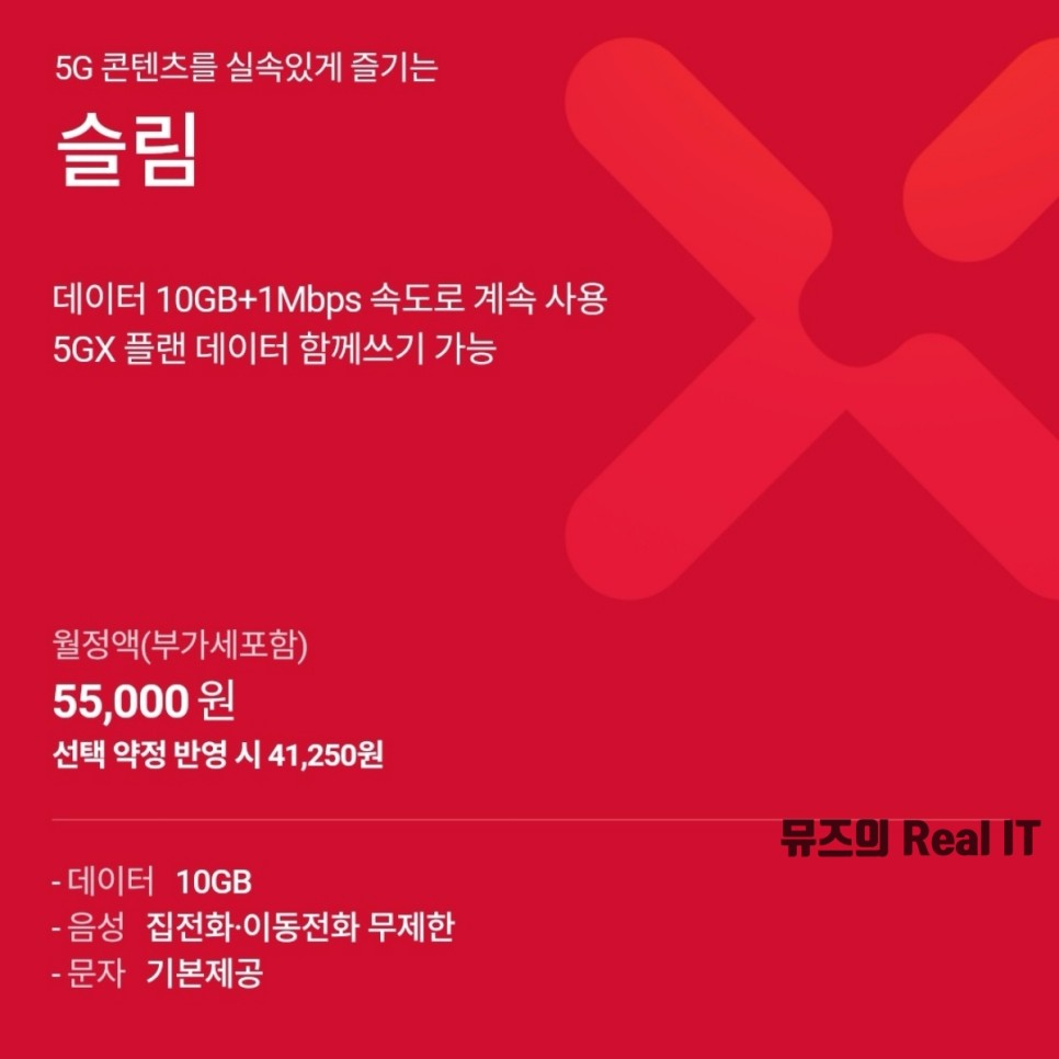 5G 슬림에는 월 10GB, 다 쓰면 1Mbps 속도로 계속 사용할 수 있다고 적혀 있습니다. 참고로 5G 슬림은 SKT나 KT나 명칭과 데이터 기본제공량이 같습니다.