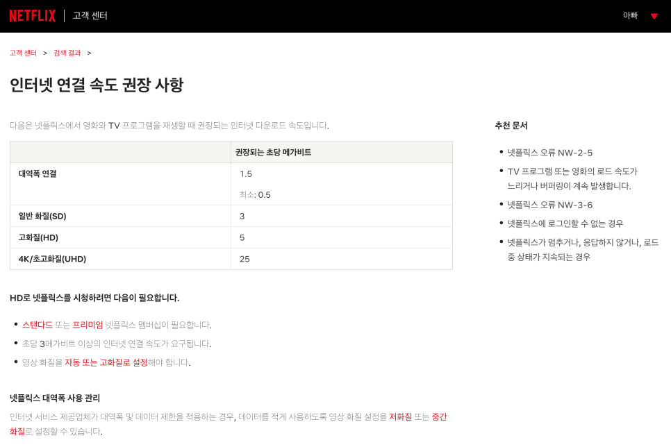 넷플릭스에서는 일반화질인 SD화질로 시청하기 위해서는 최소한 3Mbps 이상은 되어야 한다고 명시하고 있습니다. 그런데 보통 SD 화질이 아니라 HD 화질로 시청을 하기 때문에 3Mbps가 아니라 5Mbps 이상의 속도가 필요합니다.