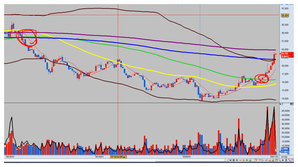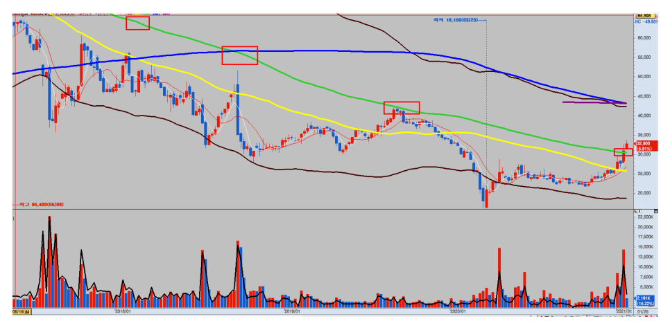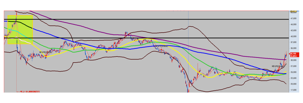한국항공우주주가차트 32017년 전부터 한국항공우주의 주봉에서 120일선(녹색) 정도까지 주가가 오른 적이 없었습니다.항상 그 자리에서 밀리는 지지부진한 흐름을 보여주었습니다.그런데 이번에는?? 주가가 위에 안착하려고 하고 있어요.’