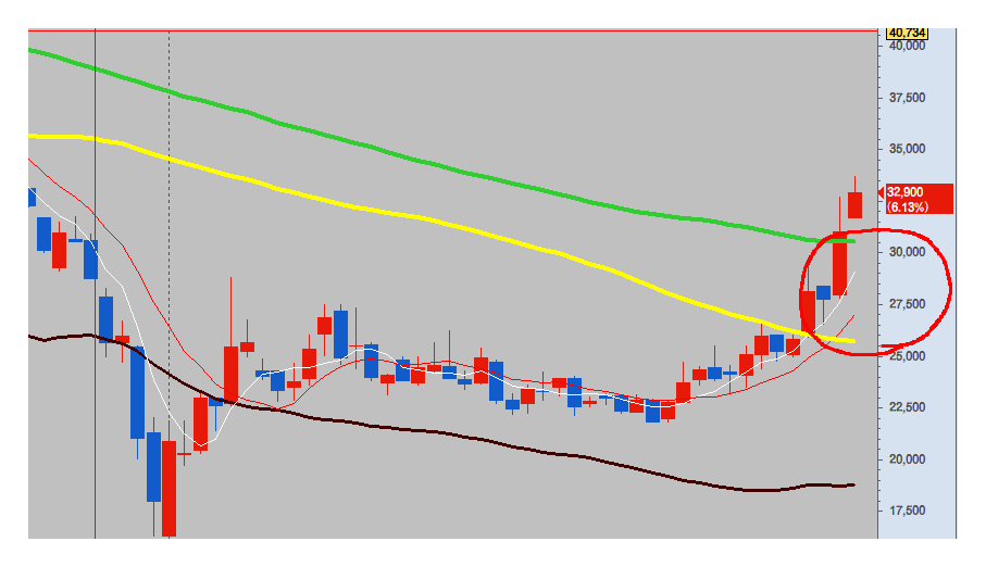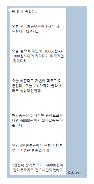 30000원~310000원 사이의 가격대가 한국 항공우주의 매력적인 가격대라고 월요일에 말씀드렸는데 (월요일 교육한 차트 이미지입니다!) 마침 오늘 그 가격대를 잡아줬으니 지금은 약 수익권입니다.