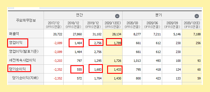 한국항공우주주가차트1 2018~2019년 #한국항공우주의 이익 500억~1600억 사이 형성주가는 5만원이었습니다.지금은요? 당기순이익이 나쁘지 않군요. 우선 코스피 우량주에 실적도 개선되는 상황에서.
