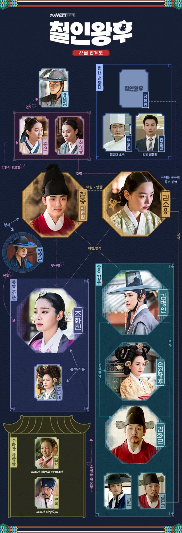 ‘조화진’ 역할에서 철종이를 우연히 만나 사랑에 빠진 참사랑이라고 생각하는 인물입니다이후 조화진은 후궁에 봉해진 후 철종의 마음을 지키기 위해 점차 검게 변했습니다.철인왕후의 인물 관계도