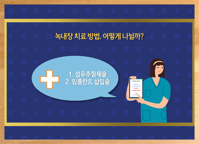 녹내장 치료법은 크게 약물 치료와 레이저에 의한 수술 치료로 나눌 수 있습니다 일반적으로 약물에 의해 안압을 서서히 낮추는 치료를 하는 것이 일반적인데 약물치료 후에도 안압이 충분히 내려가지 않으면 수술치료를 합니다.