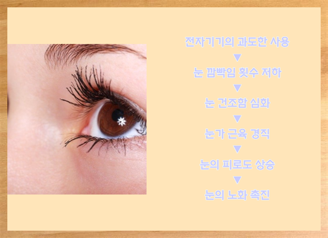 예를 들어 장시간 스마트폰을 사용하면 안압이 높아짐과 동시에 눈 깜박임도 줄어듭니다. 이로 인해 눈의 건조가 깊어지면 눈이 시린 증상에 의해 반사적으로 눈을 찡그리게 됩니다만. 이런 일을 반복하면 눈가 근육이 경직되어 눈의 피로도가 축적되고 축적된 눈의 피로는 결국 각종 안질환의 주요 원인인 안구의 노화까지 촉진됩니다.