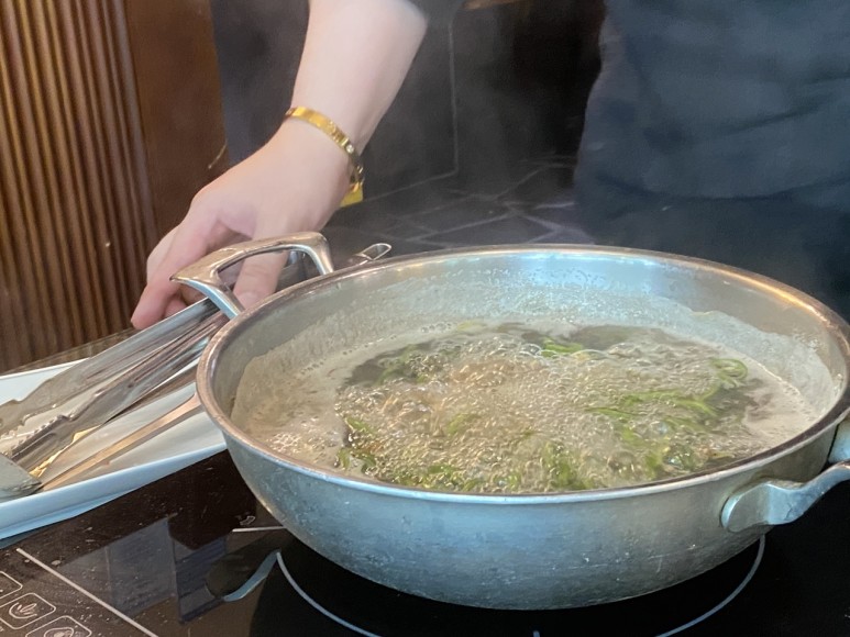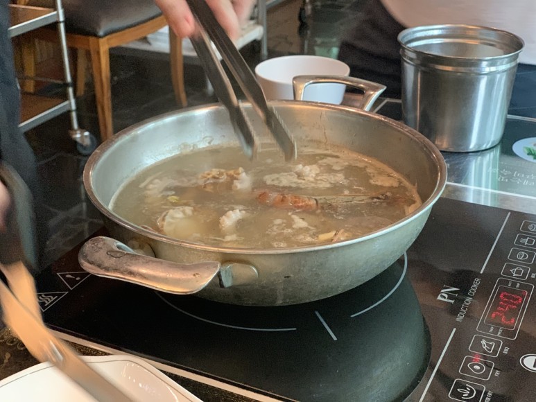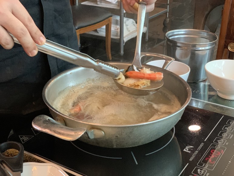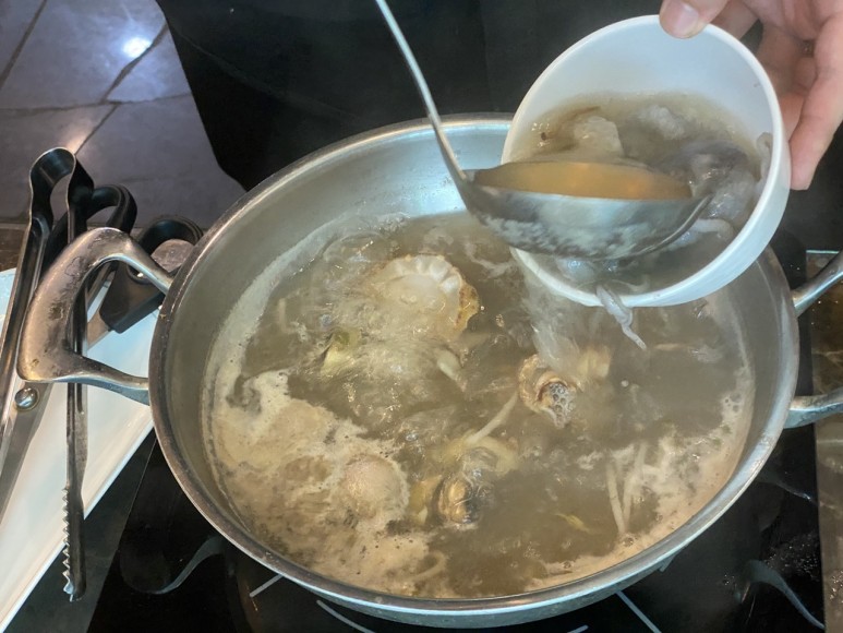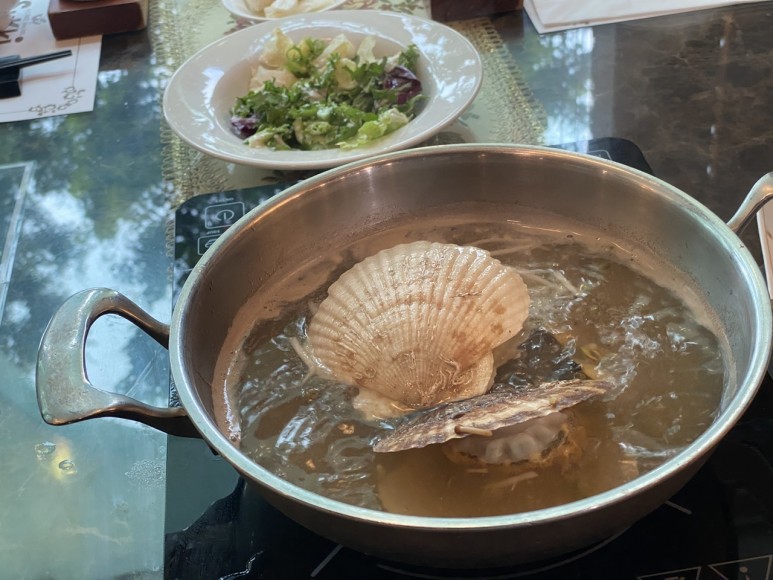 그 화려한 재료는 마사니 여러 가지 해산물입니다!신선도 좋은 해산물을 육수에 살짝 익혀줍니다.원래 바닷가재도 취급하는 가게인데 다른 해산물, 샤브샤브용으로 사용하는 새우와 가리비, 낙지, 전복 등도 퀄리티가 아주 좋았습니다.
