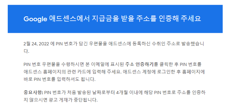 조치 필요: 애드센스에 등록된 수취인 주소를 인증해주세요.