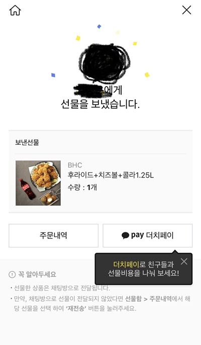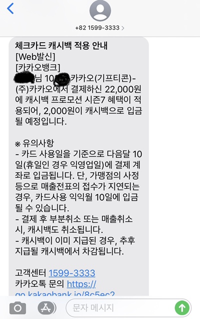 + 이틀 전 카카오톡 선물로 BHC프라이드+치즈볼세트 22,000원을 결제했다. 캐시백이 적용돼 2,000원이 입금될 예정이라고 문자메시지를 받았다. 카드 사용일 기준으로 다음 달 10일 결제계좌에 입금된다는 것.