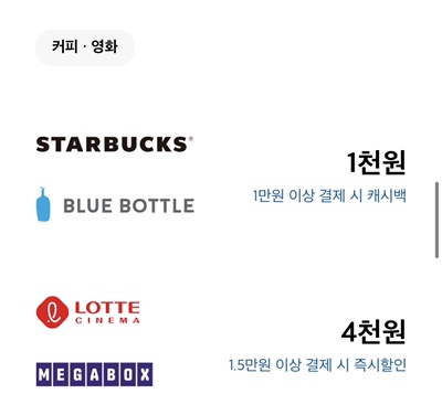 4. 조마조마 블루보틀도 1만원 이상 결제시 1천원 캐시백. 이쯤이면 10%의 혜택이 보편화된 것처럼 느껴지네.’블루보틀’이라는 단어를 언급하니까 진한 라떼가 땡기네.내 사랑, 가방에서 편하게 노트북으로 일하고 책 읽던 시절이 꿈만 같아. 롯데시네마와 메가박스는 15,000원 결제 시 4천원 즉시 할인.