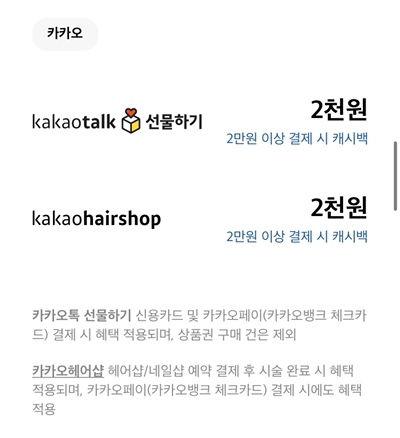 3캬! 이거 대박이다 카카오 선물 2만원 이상 결제시 2천원 캐시백. 카카오헤어는 한번도 이용해본적이 없어서 너무 ㅎㅎㅎ