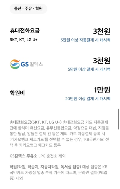 휴대전화 요금 5만원 이상의 자동결제 시에 3천원의 캐시백인데, 난영은 무엇을 하고 있었을까…??? 체크카드 발급시에 신청해야 했는데, 지금까지 잊고 있었다. 씨티은행과 카카오뱅크 제휴 신용카드가 지난주 도착했으니 통신여금 할인혜택 여부를 체크해 봐야 한다. 혜택이 더 좋은걸로 자동이체 계좌를 만들어야겠어.GS칼텍스도 자동차 기름을 넣는 분에게는 매력적인 혜택인 것 같다. 단, LPG주유소는 제외한다. 학원비 캐시백은 엄마들이 너무 반가운 혜택!