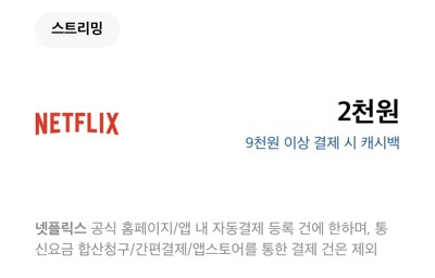 1넷플릭스 공홈 앱 내 자동결제 등록건에 한해 캐시백. 9천원 이상인 경우 무려 2천원을 캐시백하는 휴대폰결제를 통한 합산청구, 간편결제, 앱스토어 결제건은 제외된다.
