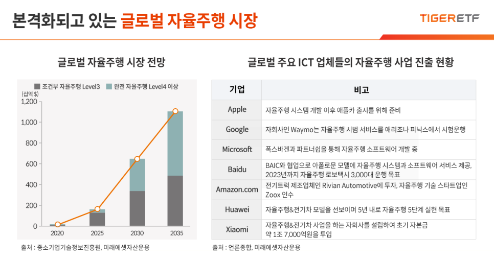 전기자동차와 자율주행시장은 반도체 시장과도 연결됩니다. 자동 운전 시스템을 확보한 전기 자동차에는 꽤 많은 반도체가 필요하기 때문입니다. 자율주행 수준이 높을수록 반도체 사용량이 증가하기 때문에 전기자동차와 자율주행 시장이 발전함에 따라 반도체 시장도 혜택을 받을 것으로 기대하고 있습니다TIGER 글로벌 자율주행 & 전기차 SOLACTIVE ETF 상장! 이렇게 급변하는 미래차 시장에서 자율주행, 전기차, 반도체 시장에 집중 투자할 수 있는 상품이 출시됩니다. 7월 20일 상장하는 TIGER 글로벌 자율주행 & 전기차 SOLACTIVE ETF입니다.
