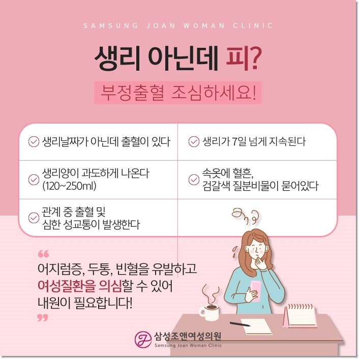 많은 여성들이 부정출혈을 생리로 오해하기 쉬운데 가볍게 생각하지 마시고 꼭 어떤 문제로 인해 발생하는지 확인해 보시기 바랍니다.오늘 알려드린 내용을 기억하시고 생리 주기를 확인해 보시기 바랍니다. 부정출혈이 의심되는 경우 원인을 정확하게 진단받고 원인에 따른 치료를 통해 효과적으로 개선해 보시기 바랍니다.