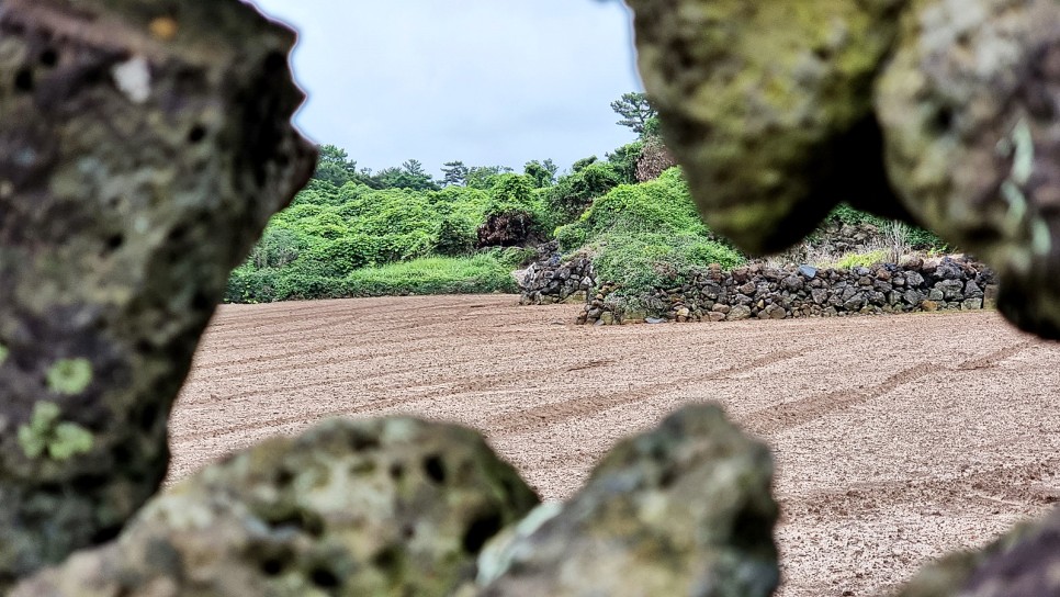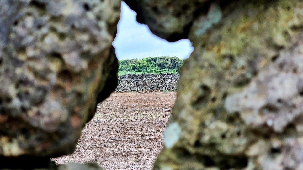 천 개의 눈 너머로 밭풍경이 보인다. 제주에서만 볼 수 있는 풍경이다.