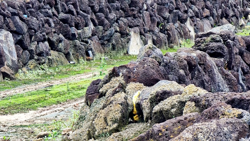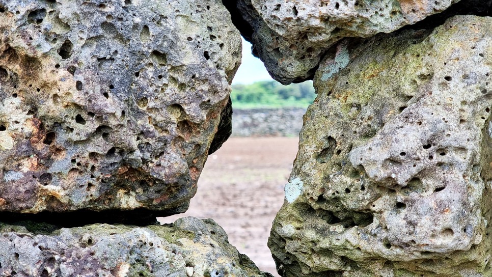 ‘천 개의 눈’ ‘만 개의 눈’을 가진 진빌레 밭담의 풍경이다. 혹자는 예쁘게 쌓은 밭담 사이에 구멍이 송송 뚫려 있는 모습을 보고 천 개의 눈을 가진 것 같다고 말한다. 구멍 뚫린 밭담 너머로 건너편 밭담에 내 눈의 초점이 맞춰진다.