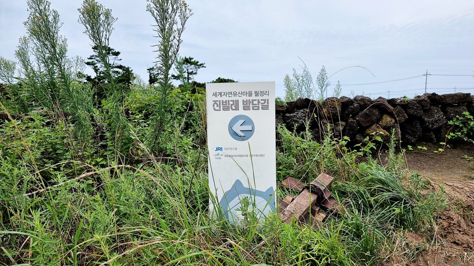 진빌레밭 담장길 중간지점에서 종착지로 발걸음을 옮기는 이정표다. 월정리 마을 일대는 용암동굴이 많이 분포하는 것으로 알려져 있다. 짐빌레밭 담장길에는 세계자연유산으로 등록된 당처물동굴과 용천동굴 줄기가 있다. 당점물 동물은 1995년 마을 주민들이 밭농사를 위해 중장비로 땅을 고르다 발견됐다.