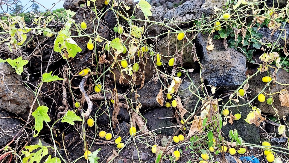 전형적인 제주 밭담 풍경이다. 검은 제주의 검은 현무암석을 쌓아올린 밭담장의 풍경과 노란 열매가 인상적으로 느껴지는 풍경이다.
