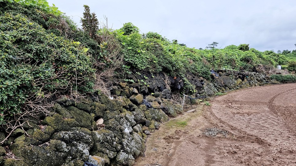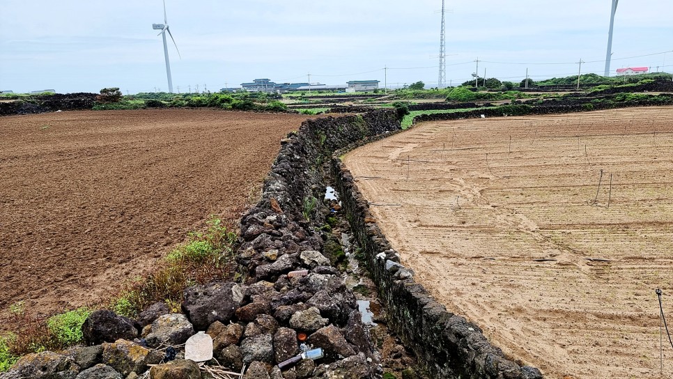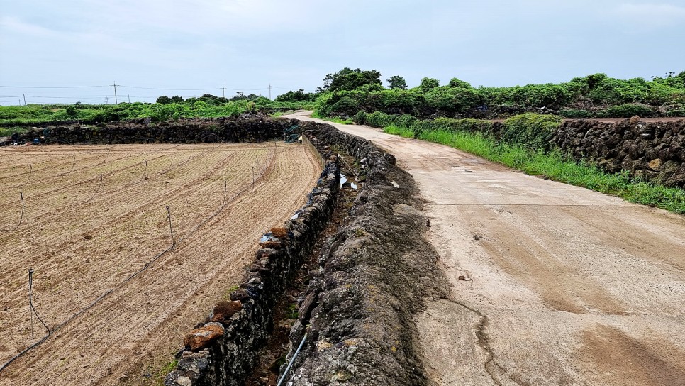 이번에 제주시 구좌읍 월정리 ‘빌레밭 담장길’을 걸으며 눈여겨본 밭담의 풍경이다. 밭담을 이용해 도랑을 낸 것처럼 경계를 나눈 모습이 인상적이었다. 일부러 저렇게 만든 이유는 밭에 돌이 많아서일까. 신경 쓰이다