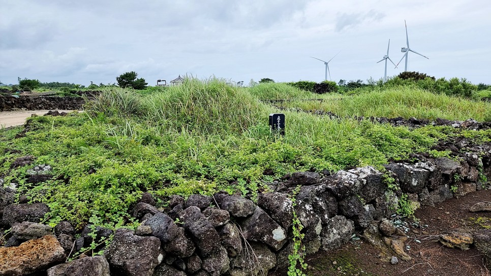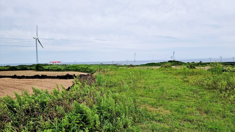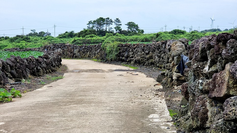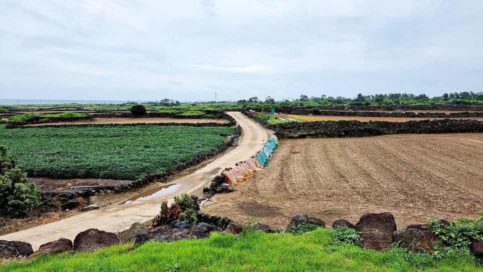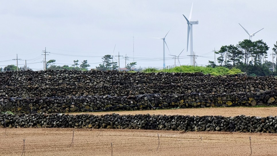 밭담길을 걸어서 바라본 바람경이다. 전형적인 제주 농촌 모습이다. 쌓아올린 밭담 안으로 고구마와 콩이 익어 있는 계절을 준비하고 있다. 거무스름한 밭담 위로는 풍차 비슷한 풍력발전기가 소리를 내며 돌고 있다.
