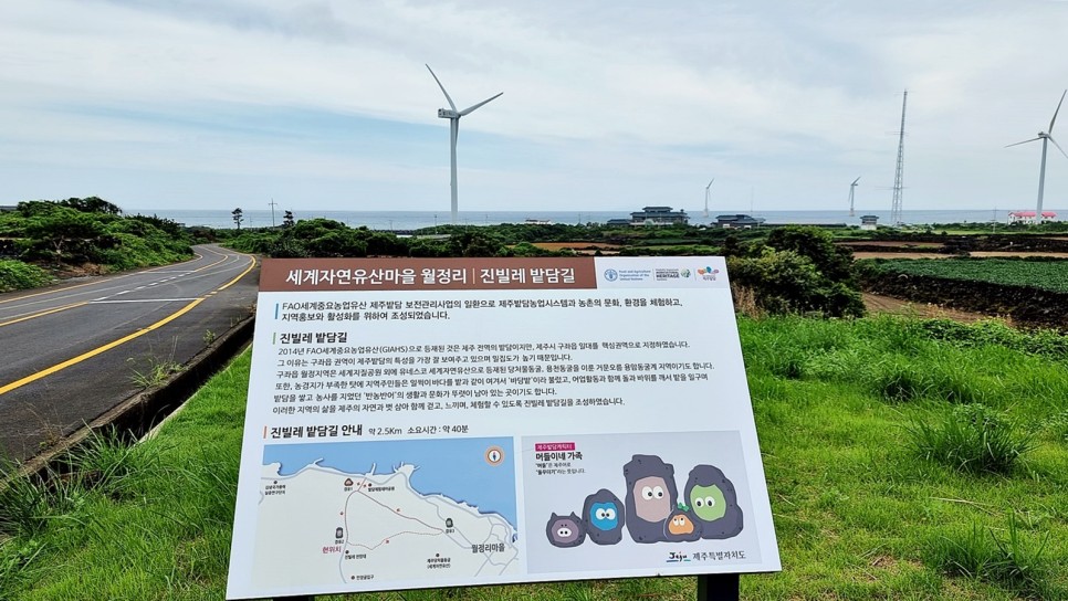 진빌레밭 담장길은 약 2.5㎞로 짧지만 볼거리가 많은 길이다. 이정표가 잘 되어 있어서 걷기가 매우 편하다.