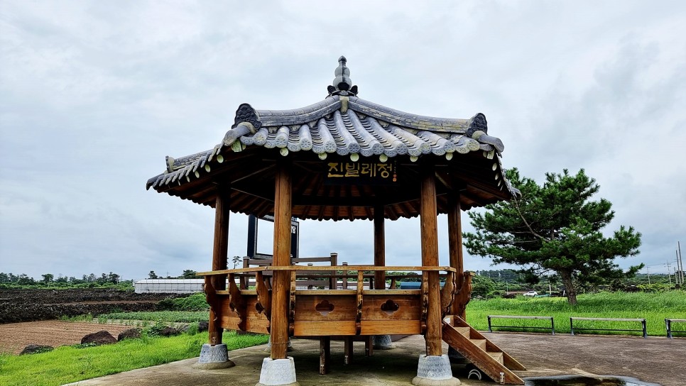 구릉지대에 있는 진빌레정에 오르면 사방팔방의 풍경이 드넓게 펼쳐지고, 검은 제주도의 검은 현무암으로 곱게 쌓은 밭담이 사방팔방으로 굽어지며 끝없이 펼쳐지는 풍경이다. 진빌레정 옆에는 방문객들이 기념사진을 찍을 수 있도록 포토존이 설치돼 있다.