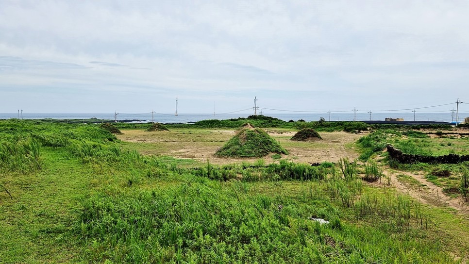 진빌레밭 담장길을 따라 종착지로 이동하면 천연잔디가 가지런히 뻗은 야트막한 언덕 같은 모래언덕이 눈에 들어온다. 그런데 길가에서 사구길이 밭담 안으로 오솔길이 이어진다. 맹지로 이어지는 사구다. 사구에서 이런 길을 따라 안으로 들어서면 맹지에는 마치 큰 봉분 같은 모래로 된 모래산이 눈에 들어온다. 마치 왕후나 왕후의 무덤인 능과 같은 모습이다.