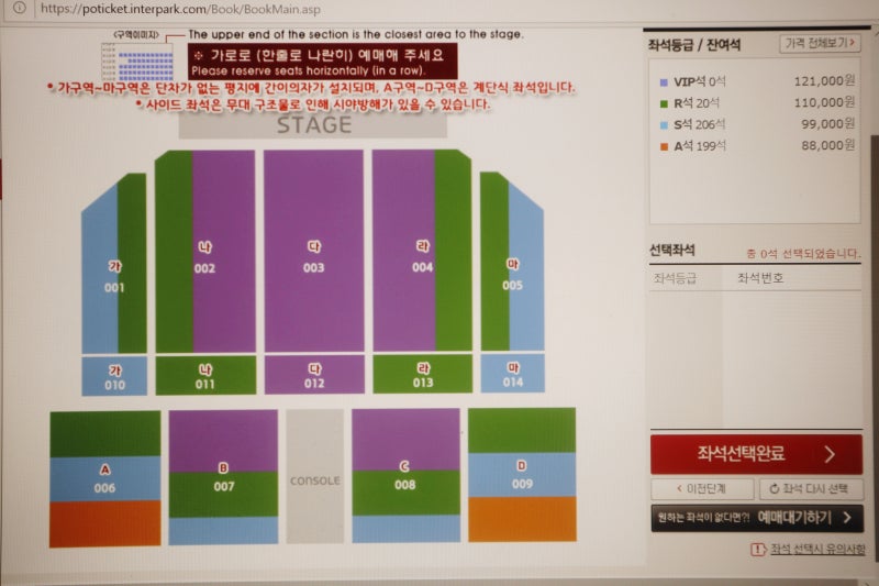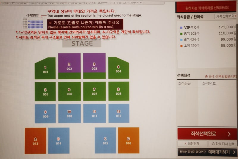 많은 팬이 몰릴수록 ‘예매’ 클릭을 해도 다소 느리게 화면이 바뀔 수 있다. 하지만 절대 새로고침을 하지 않고 기다려야 합니다.