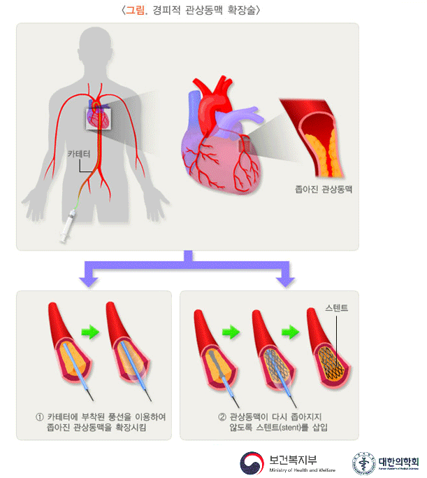 관상 동맥의 경우 혈관을 조영제로 개통시키는 관상 동맥 조영술과 스텐트 삽입술을 고려하여 심각한 경우 관상 동맥 우회술을 실시합니다.