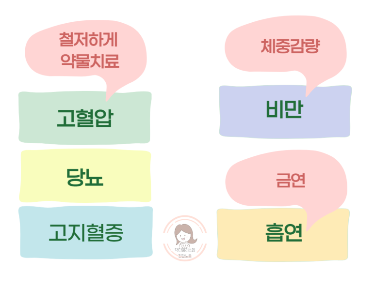 고혈압, 당뇨, 고지혈증의 3가지 질환이 있는지 먼저 확인합니다.해당 질환이 있으면 해당 질환에 대한 약물치료를 우선 시행합니다.