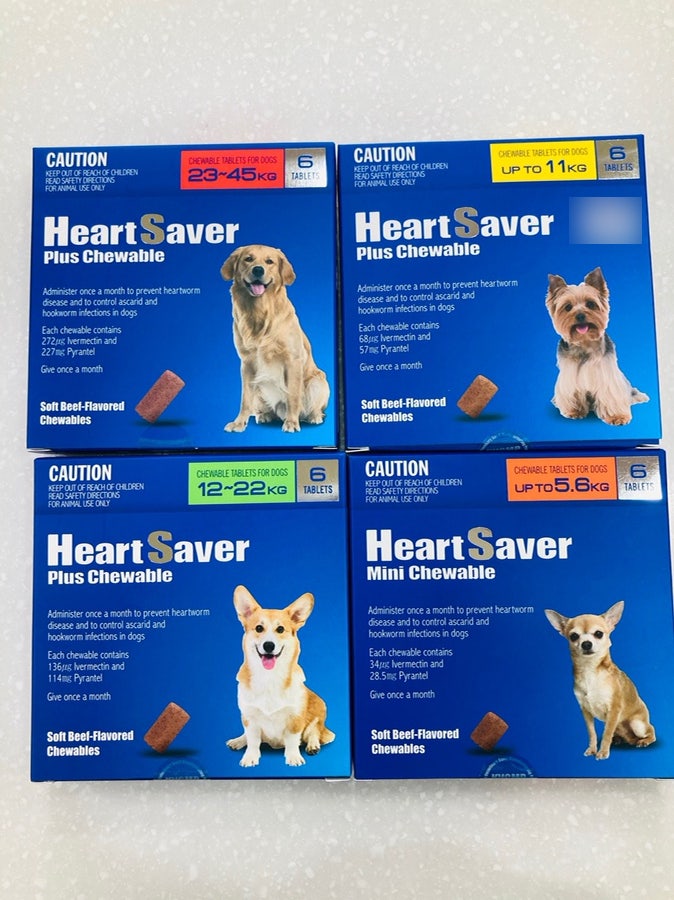 용법 및 용량견 체중 kg당 이버멕틴 6.0μg 및 피란텔 5mg의 용량을 1개월 간격으로 연속 경구 투여합니다.반려견의 체중에 맞는 제품을 선택하신 후 1츄어블씩 투여하시기 바랍니다. – 5.6kg이하(주항) 11kg이하(노랑) 12~22kg(초록색) 23~45kg(빨강) 효능 및 효과 강아지 심장사상충 예방 견구충 치료, 개회충 치료, 협두구충 등 구충 및 예방if]> 주의사항 콜리(Colli)종에는 특이하게 독성이 발현될 수 있으니 사용하지 마십시오.사용설명서를 충분히 읽고 사용해 주세요.어린이의 손이 닿지 않는 곳에 보관하십시오.실수로 사람이 먹은 경우는 적시에 의사의 조치를 받아 주십시오.