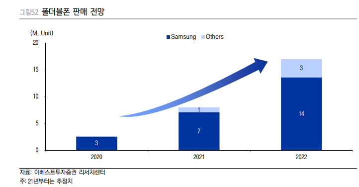 ● 2021년 폴더블폰 전체 판매량은 800만 대 수준으로 삼성의 점유율은 90%에 이를 것으로 보이며 2022년 시장은 두 배 이상 성장하는 가운데 삼성의 영향력은 지속될 것이다. 또 내년 스마트폰 시장 규모 대비 폴더블폰 점유율은 1% 수준이며 초고가 $600 이상 시장으로 한정해도 7% 수준이어서 향후 초고가 시장 침투 확대를 통한 성장 전략이 효과적일 것으로 보인다.