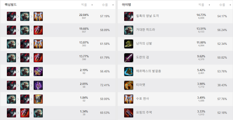 안녕하세요. 몇 길입니까? 오늘은 롤 시즌 9 크레드린 템플릿 스킬 카운터 탑 미드 공략입니다. 클래드는 처음 나왔을 때부터 스펙에서 스킬 패시브에 궁극기도 사용하기 쉬워 보여 자주 사용했지만 의외로 난이도가 높아 망하는 경우도 있는 데다 챔피언이 재미없어 성능이 좋을 때도 많지는 않았습니다. 그래도 쓸 때는 뜨거운 모습도 많이 보여준 챔피언입니다. 특히 궁극기에서 대히트를 치는 경우도 있고, 아군을 빨아들일 수도 있기 때문에 이니시가 좋은 데도 잘 쓰이지 않습니다. 그래서 픽률을 보면 톱 챔피언 52명 중 3%로 24위이고 승률은 그래도 51.3%로 10위로 조금 준수합니다. 미드필드로 가면 53명 중 071%로 48위는 거의 안 쓴다고 보면 되고, 픽률이 적어서 그런지 승률은 54.17%로 3위입니다.