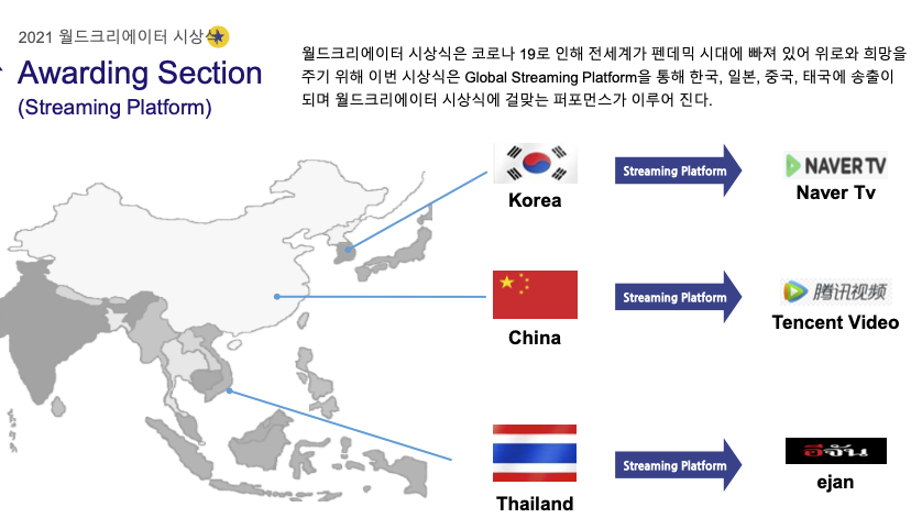 2021 월드 크리에이터 ▷ 일시 : 2022.2.23.12시~17시 ▷ 장소 : 일산 빛마루방송센터 ▷ 송출 : 방송국, NAVER TV, YouTube (베트남/태국/중국 등지에 방송과 web으로 송출)