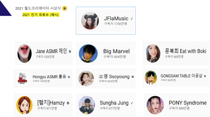 월드 크리에이터 시상식은 2021년을 마무리하는 시상식입니다.각 부문별 수상을 통해 크리에이터 활동을 격려하고 많은 사람들에게 알리는 역할을 수행하고 있습니다.