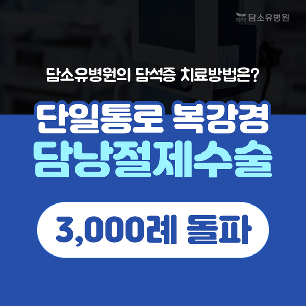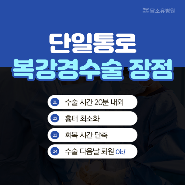 I담소의 단일 통로 복강경 수술 1990 년 이전에는 모든 담낭 절제술은 개복으로 진행되었습니다. 절개를 통해 이뤄지기 때문에 흉터가 크고 염증이 생기는 등의 합병증이 발생할 확률이 높아질 뿐만 아니라 입원일수와 회복기간이 1주일 안팎 걸리는 큰 수술이었습니다. 하지만 1990년 이후 작은 구멍으로 카메라를 삽입해 수술을 하는 3포트 복강경 수술이 담석증 치료 방법으로 자리 잡습니다. 3~4개 정도의 구멍을 뚫어 이뤄지는 이 방법은 개복수술로 인한 합병증도 거의 없고 수술시간도 30분 내외로 단축시키고 입원기간도 2~3일 정도로 짧아지도록 했습니다.
