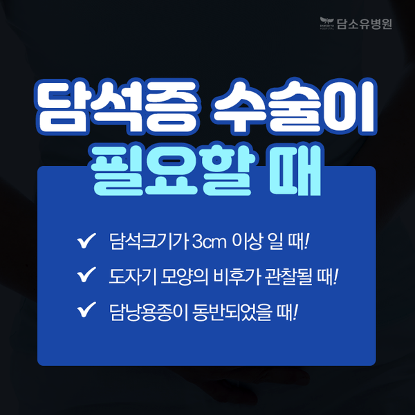 I 질병 치료를 해야 하는 경우, 담석증 치료가 필요한 경우를 자세히 살펴보면 첫째, 증상을 동반한 담석증의 경우입니다. 둘째, 담석의 크기가 약 3cm가 넘는 경우입니다. 세 번째는 도자기 모양과 같은 비정상적인 벽의 비후가 있는 경우입니다. 넷째, 비정상적인 담낭의 기능 저하가 있는 경우입니다.다섯째, 담석증과 함께 담낭 용종(담석을 제외하고 담낭벽 안쪽으로 돌출하는 모든 형태의 혹)이 동반되는 경우입니다.이러한 5가지 경우는 담석증 치료 과정을 진행하고 담낭을 제거하는 담낭 절제술을 실시하게 됩니다. 돌만 제거하면 끝이 아닐까 하는 의문을 가질 수 있지만 돌만 제거하는 것은 불가능하고 제거하게 되더라도 재발할 가능성이 높기 때문에 근본적인 치료는 담낭을 제거하는 것입니다.