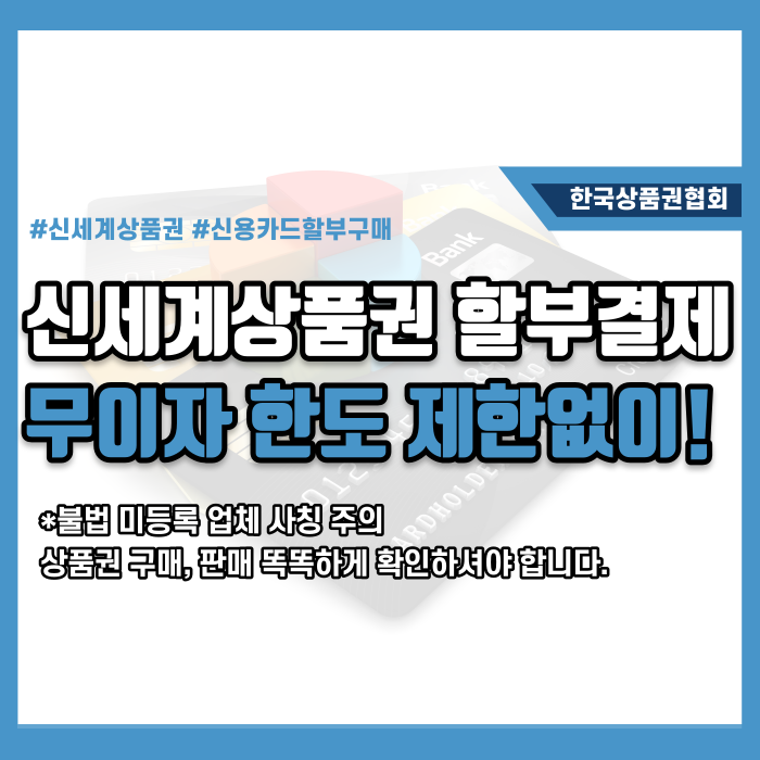 뿐만 아니라 신용카드 상품이기 때문에 당연히 무이자 6개월, 최대 12개월 할부를 받을 수 있습니다. 사용되는 곳이 다양한 신세계 상품권을 구입해서 기업 행사, 직원 복지 선물, 학교 행사 등에 사용해 보는 것은 어떨까요?