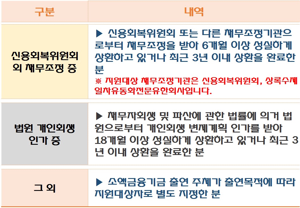 일반적으로 만 20세 이상 내국인을 기준으로 신용회복위원회 채무조정 중이면 신청할 수 있는 공통점을 갖고 있지만 꾸준한 소득 발생 여부는 중요한 포인트가 됩니다.근로자는 물론 아르바이트 중이나 사업자, 프리랜서처럼 소득 증빙이 가능하면 좀 더 혜택을 받을 수 있고, 무직자라면 한도가 줄어들게 됩니다.(프리워크아웃 대출 포함) 다만 개개인에 따라 처한 상황은 달라질 수 있기 때문에 심사 과정은 물론 저마다 한도나 이율 등은 차등 적용받아 담당자 재량이 있을 수 있으니 미리 포기하는 것은 금물이죠?