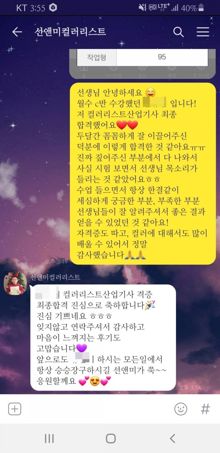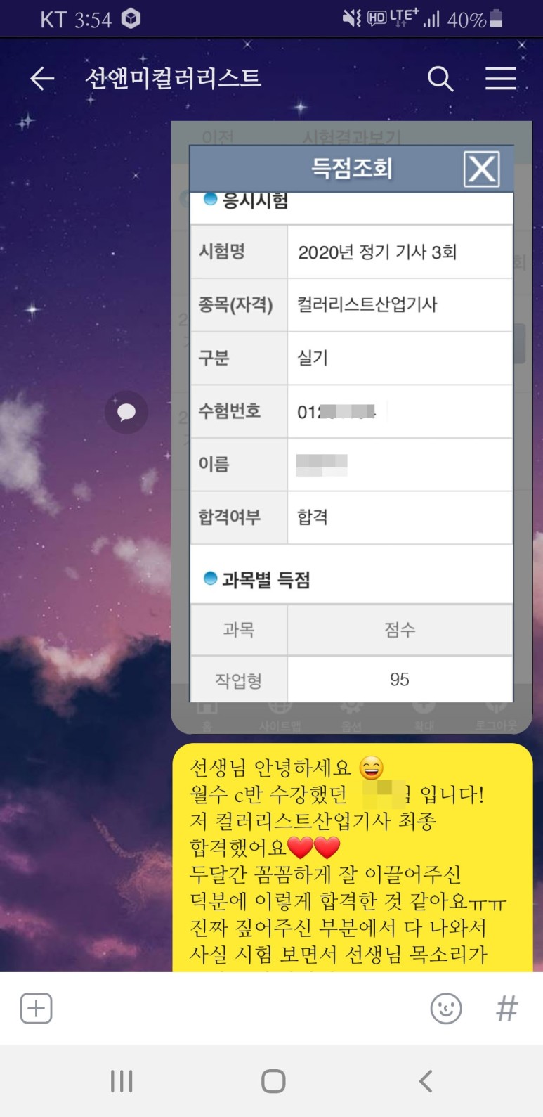 합격 발표가 나자마자 시험 전날까지 열심히 해주신 상&미 선생님께 제일 먼저 인증샷 전송!저만큼 너무 기뻐해주셔서 다시한번 감동ㅜㅜ