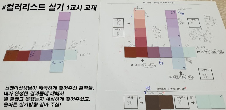 제가 썬앤미의 컬러리스트를 선택한 이유는 공통적으로 선생님들이 꼼꼼하다고 들었습니다.합격생도 그만큼 많았어요.그리고 저도 그 소감에 공감합니다.항상 수업 시작 전, 그리고 수업 시간 중간에 1:1 과제 체크 시간이 있었거든요.사실 저도 토익학원, 다른 자격증학원, 캘리그라피학원 등 정말 많은 학원을 다녀봤지만 제가 집에서 완성해나갈 과제, 수업시간 모의고사에서 완성한 결과물 모두 정말 빠짐없이 체크해주는 수업은 처음이었던 것 같습니다.