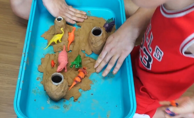 점토와 요거트 병이나 사용하지 않는 병을 이용하여 화산 모양을 만들어주고 #공룡피규어들로~멋진 #공룡시대(?)를 만들어주었어요!