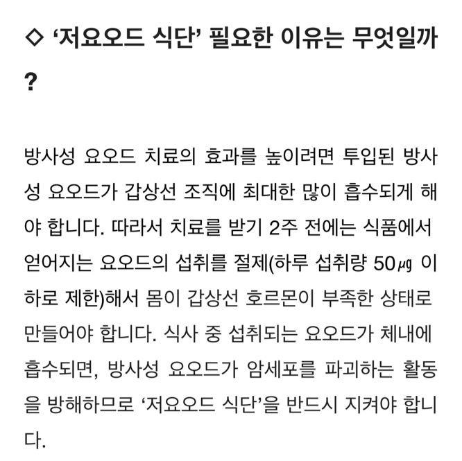 그리고 동위원소 방사선 치료 전 저요오드식으로 식단을 조절해 먹어야 한다.