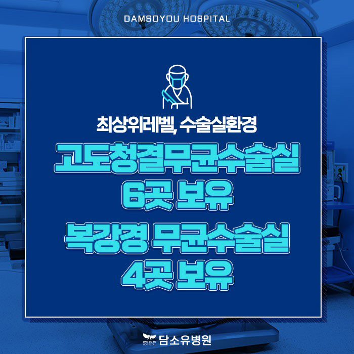 이후 회복문제로 짧은 시간이 걸리는 병원을 찾는 분들이 많은데 담소유병원은 단일 통로 복강경으로 진행하고 있으나 복부에 큰 흉터를 남기는 개복이 아닌 최소침습으로 진행되므로 회복에 대한 걱정은 하지 않으셔도 됩니다.
