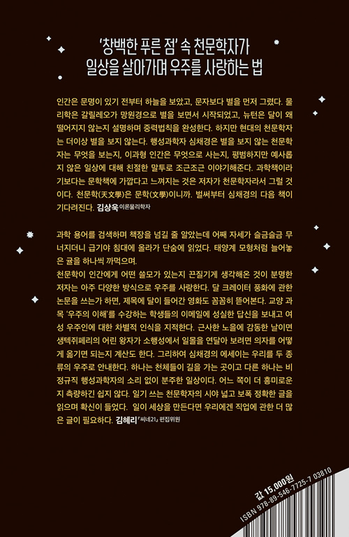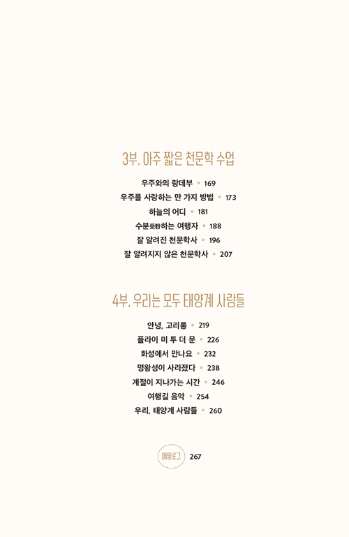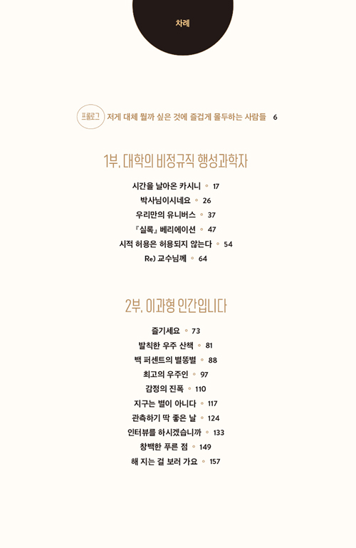 프롤로그에서 국내 천문학계는 매우 좁지만 천문학적인 범위는 천문학적으로 널리 관심을 줄 대상이 너무 많다. 그리고 유일무이한 존재가 되는 것은 외롭지만 매우 흥미로운 일이다.’