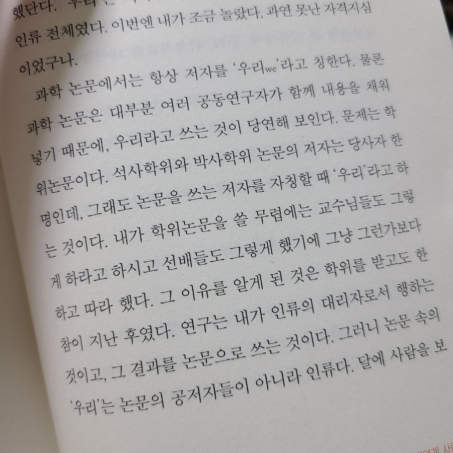 과학 논문에서는, 항상 저자를 「우리들」이라고 칭한다.연구는 내가 인류의 대리자로서 실시하는 것이며, 그 결과를 논문으로 쓰는 것이다. 그러나 논문 속의 ‘우리’는 논문의 공저자가 아니라 인류다.
