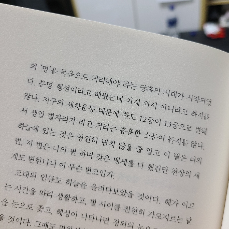 오, 이거 계속 보려고 찍어놨던 것 같은데 아니, 저번에 읽었는데 좋았던 부분을 다시 안 보니까 또 그때 감정을 까먹었네 사진 봐봐, 이게 뭐야? 분명히 행성이라고 배웠는데 이제 와서 아니라고 하잖아, 지구 세차운동 때문에 황도 12궁이 13궁으로 바뀌고 생일날 별자리가 바뀐다는 나쁜 소문이 도는 것 아니냐. 하늘에 있는 것은 영원히 변하지 않을 줄 알고, 이 별은 네 별, 저 별은 내 별과 온갖 맹세를 다했는데 천상의 세계도 변하다니 어찌된 일이냐.