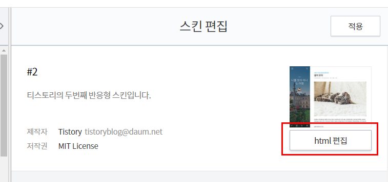 왼쪽 [꾸미기] 메뉴에서 하위 메뉴의 [스킨 편집]을 선택합니다.