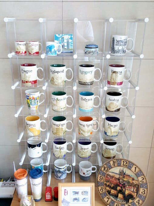 스타벅스 시티 컵의 진열은 아크릴 선반을 사서 진열해두면 아주 깔끔한 것 같다!! 양주의 높이에 맞춰 양주장을 세로로 짜서 컵을 한 줄만 놓기에는 공간이 너무 낭비된 것 같아 두 줄로 늘어놓으면 보기 쉬운데 하스 백시 찻잔은 왼쪽 상단부터 삿포로/후쿠오카/루체른/베이징 인천/제주/푸켓/상하이 말고도 내가 항상 사용하는 후쿠오카의 다른 시티 컵이 있는데 매일 커피를 마시면서 사용하고 있어.(웃음)