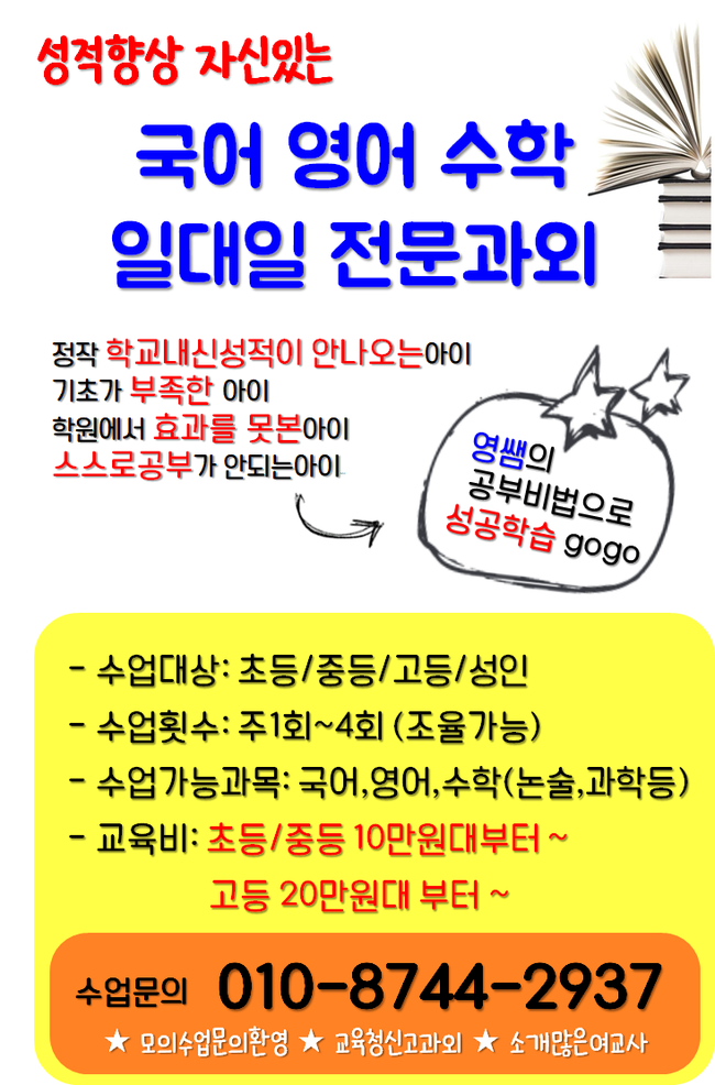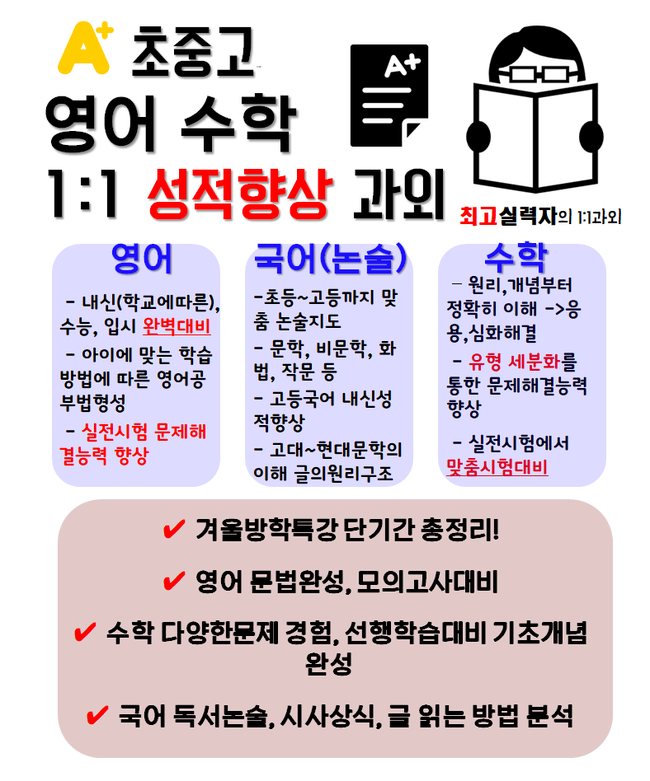 ” 일대일 수업이 필요할까요? 여름방학이나 겨울방학 시즌, 중간고사, 기말고사 전/후목동 영어과외를 많이 찾고 있는데 예전에는 학원을 다녔는데 도저히 성적이 오르지 않거나 학습이 정체되어 화제가 되어주기 위해 많은 학생과 학부모님들이 일대일 수업에 와주고 계십니다!그런데 무조건 1:1 수업이 학습에 효과를 높일 수 있을까요?NO! 아닐 수도 있어요! 아무리 학력이 좋고 지도한 경력이 많다고 해도 학생에게 맞지 않는 수업 내용으로 지도한다면?! 그래도 학습 성과가 높아질 수 있을까요?